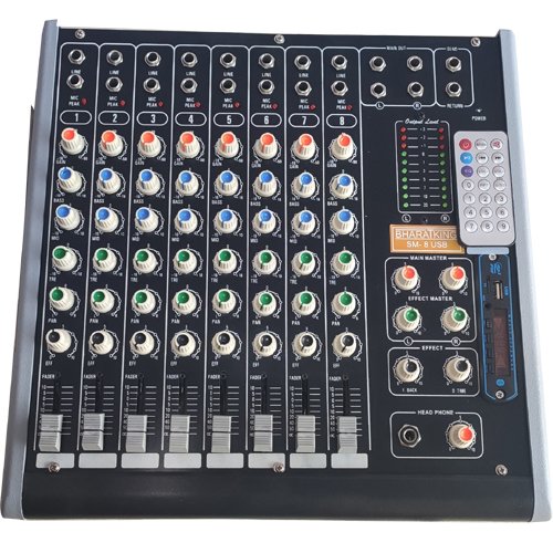 . USB Playback; Individual Gain, Bass, Mid, High Aux, Pan, Controls; Digital 16 Bit Effect Processor with LCD . Stereo RCA Outputs for Recording; XLR Bal Outs & TRS Unbalanced Outs; Main (L+R), Phones & Master Effect . Extra Stereo In with volume control; Individual PFL, Echo, Peak, LEDs on each inputs; Phantom with LED for condenser mics 11 x 2 Segment LED Level meter; Delay, repeat, Effect Send & AUX Controls