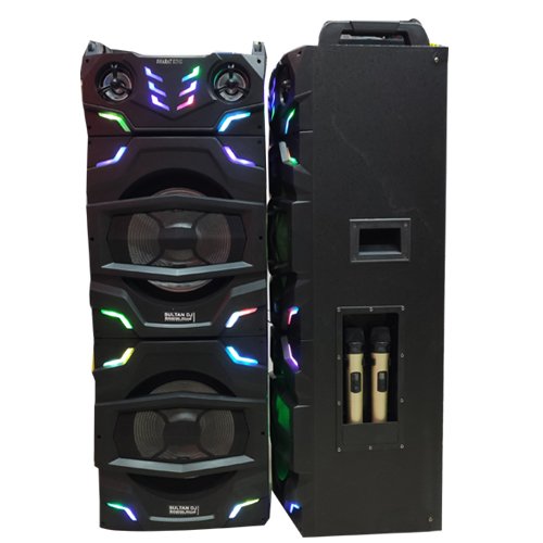 . DOUBLE 12 INCH SPEAKER TOWER . 2 CORDLESS MIC . SPECIAL LIGHTS ON FULL TOWER . USB . BLUETOOTH . AUX . 3 FT HEIGHT OF BOTH TOWER . DELIVERY CHARGES EXTRA
